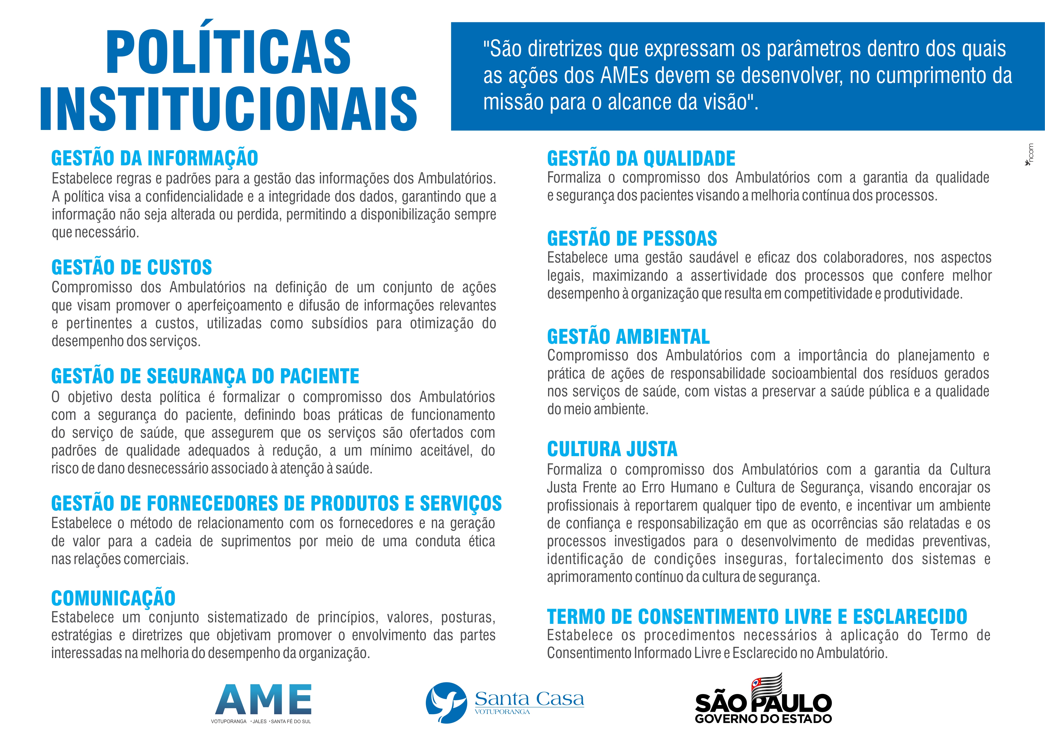 Os Ambulatórios Médicos de Especialidades de Votuporanga, Jales e Santa Fé do Sul, têm como Política de Qualidade atender as necessidades de seus clientes, com o compromisso de melhorar continuamente a qualidade dos serviços e a eficácia do sistema de gestão da qualidade, objetivando a Segurança do Paciente, a Responsabilidade, Humanização e a Gestão dos Riscos.